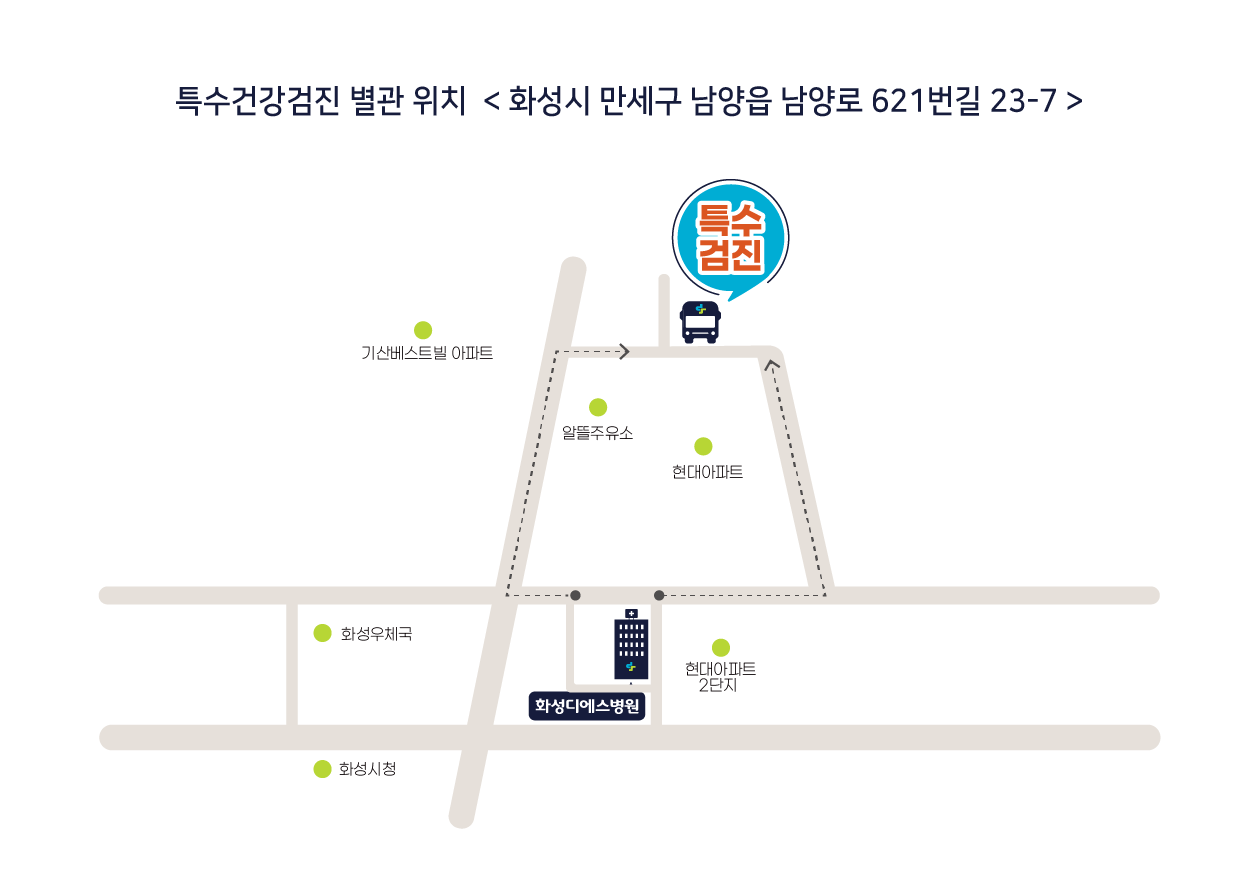 화성디에스병원은 고용노동부 지정 특수검진기관으로서 유해인자에 노출되어 있는 근로자들의 보다 건강한 근로환경을 위하여 노력하고 있으며 원내 뿐만 아니라 원외 출장검진을 제공하여 근로자 분들의 편의를 생각하고 있습니다.